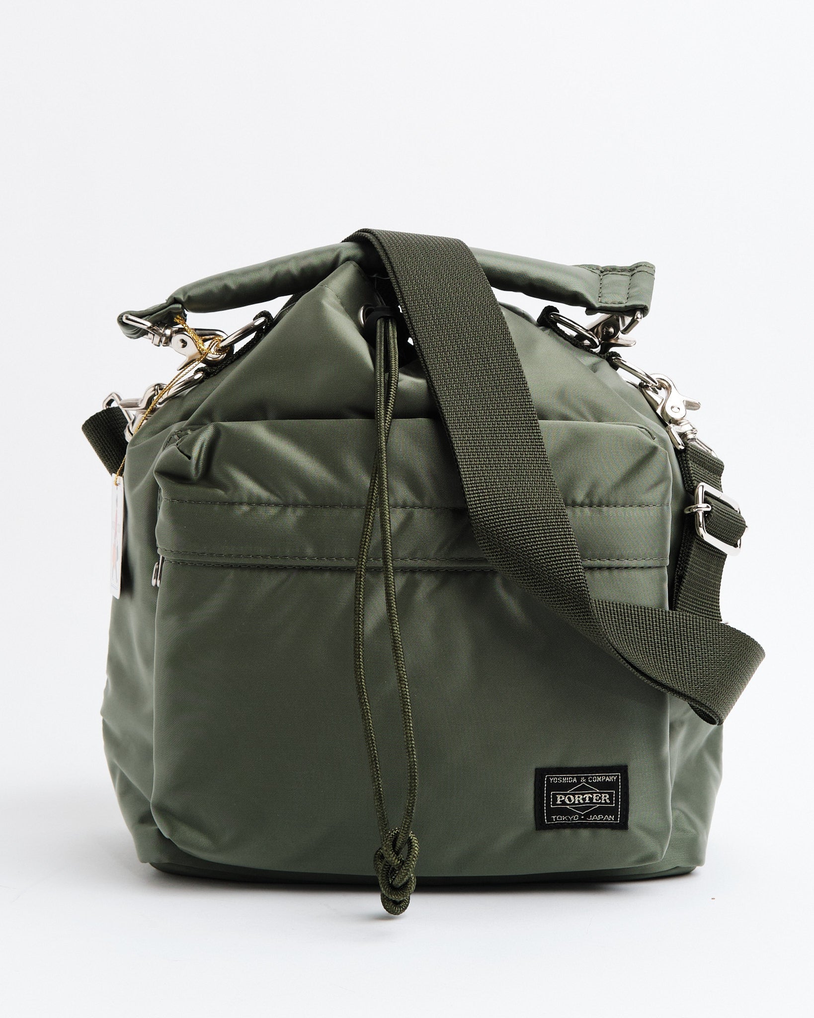 Check out the PORTER YOSHIDA 381-16853-30 BALLOON BAG (L) in a lovely SAGE GREEN shade. This bag draws inspiration from pouches used for carrying small items and boasts a unique rounded shape. Made from nylon twill fabric with a cotton bonding process it has a shine and feels luxuriously soft to the touch. The top drawstring closure provides access to the main compartment while the adjustable cord stopper allows you to customize the bags form. It comes with handles and a shoulder strap for versatile carrying options. The bag features two drawstrings, one in orange design and another matching the bags color offering flexibility to match different styles and occasions. The interior is elegantly lined in navy blue. With dimensions of W; 220mm, H; 290mm, D; 130mm (W; 8.7in, H; 11.4in, D; 5.1in) and weighing at 432g (15.2oz) this spacious bag is perfect for holding items, like a 500ml water bottle or tablet.