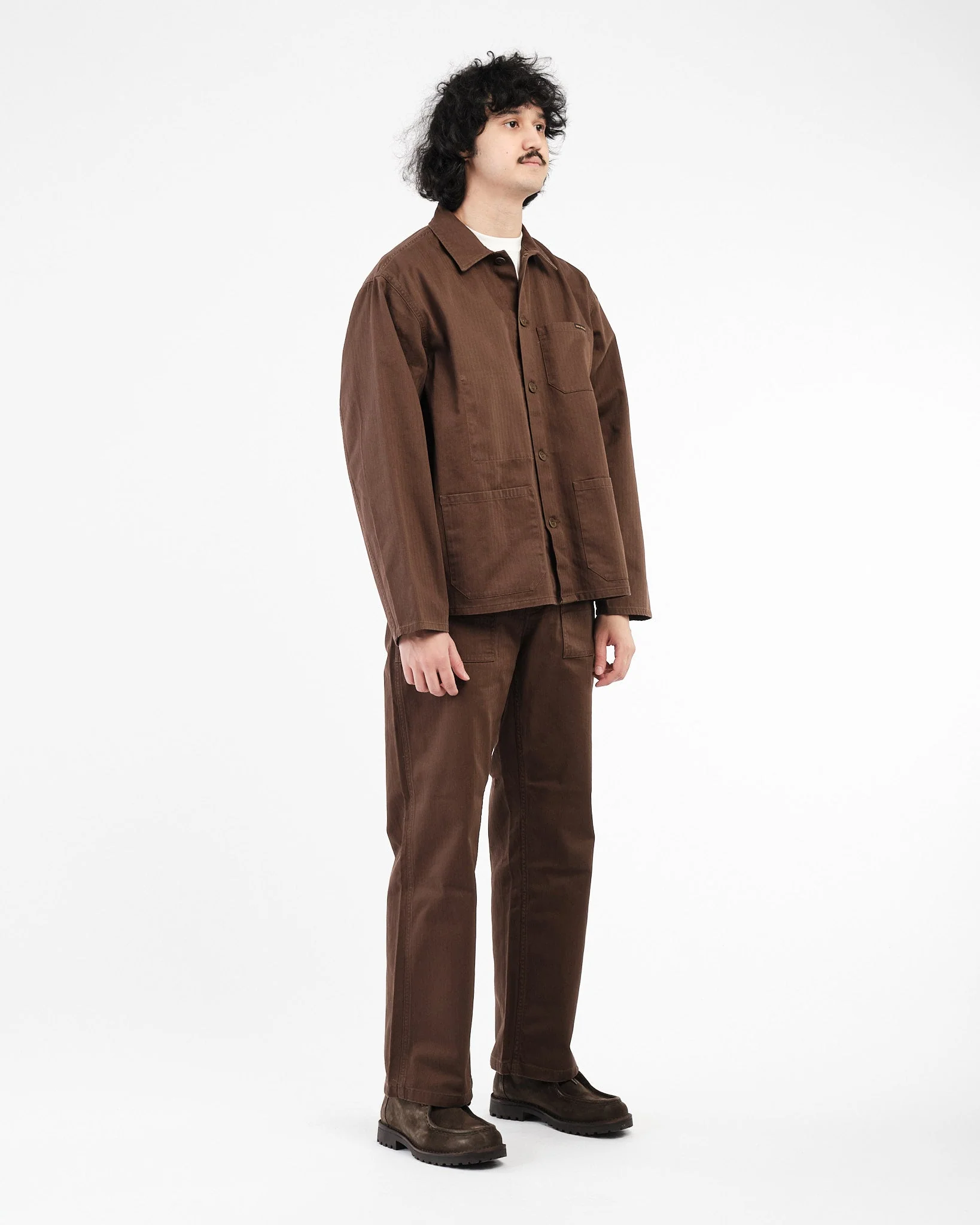 Crafted from a durable herringbone fabric, this jacket offers both comfort and resilience. It features a traditional chore jacket silhouette with a button-down front, multiple pockets, and a relaxed fit that ensures ease of movement. The rich walnut hue adds a sophisticated touch, making it suitable for a variety of occasions.