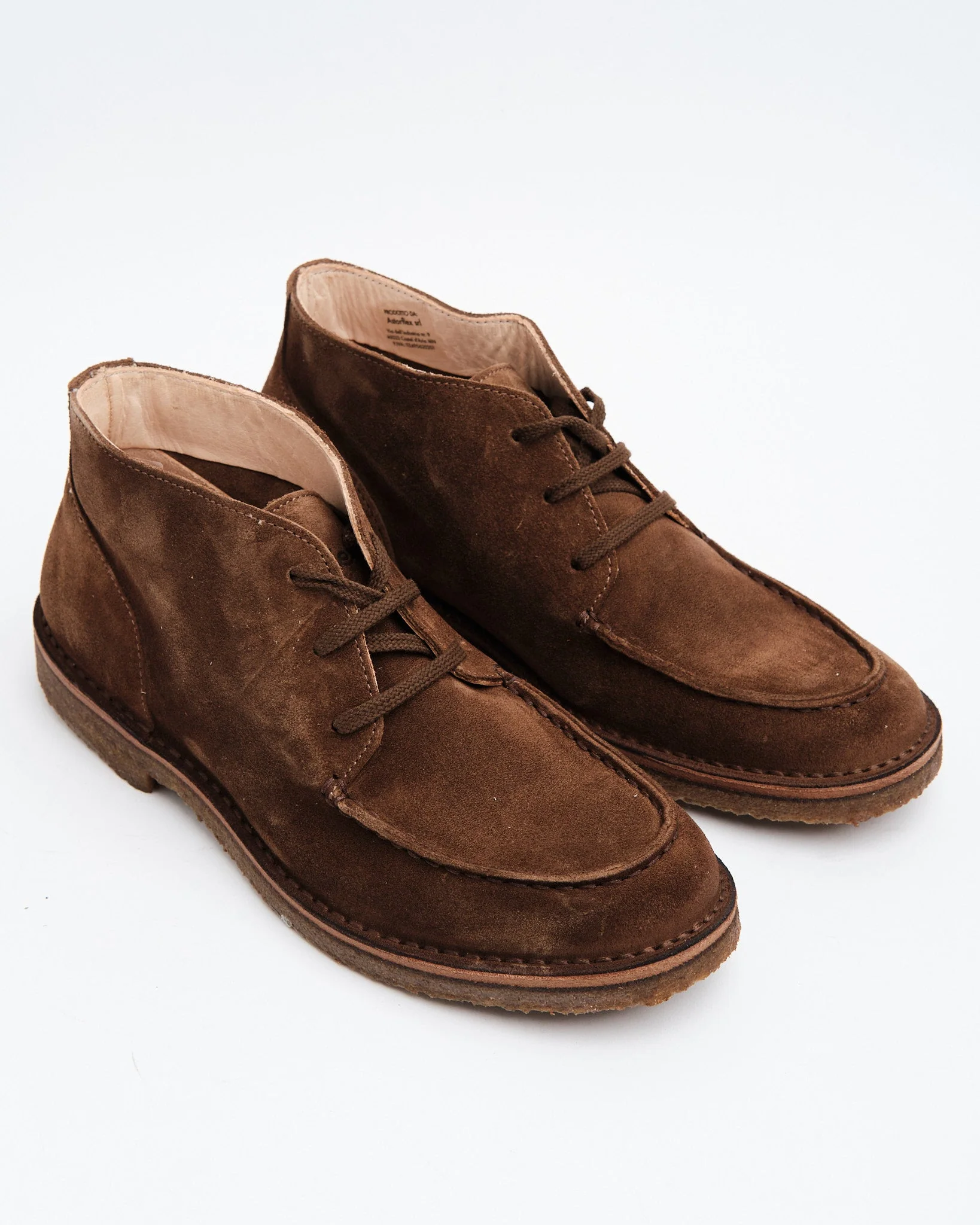 The Astorflex Deukeflex Chukka Boot in a Dark Khaki color showcases the artistry of Italian craftsmanship by combining classic methods with contemporary comfort features. Expertly made in Italy. Fashioned from premium suede sourced from Tuscanys finest materials for a luxurious touch and natural earth toned appearance. Featuring elastic side panels for effortless slipping on and a snug fit that stays in place securely. Equipped with a full crepe rubber sole to deliver exceptional cushioned support and reliable traction, on diverse types of terrain. The Deukeflex Chukka Boot features a leather lining. Footbed that enhance breathability and comfort inside the shoe to keep your feet feeling great all day long. You can see Astorflexs dedication to sustainability in their choice of vegetable tanned leathers and eco friendly materials for this eco conscious boot option thats perfect, for those looking for both style and responsibility.