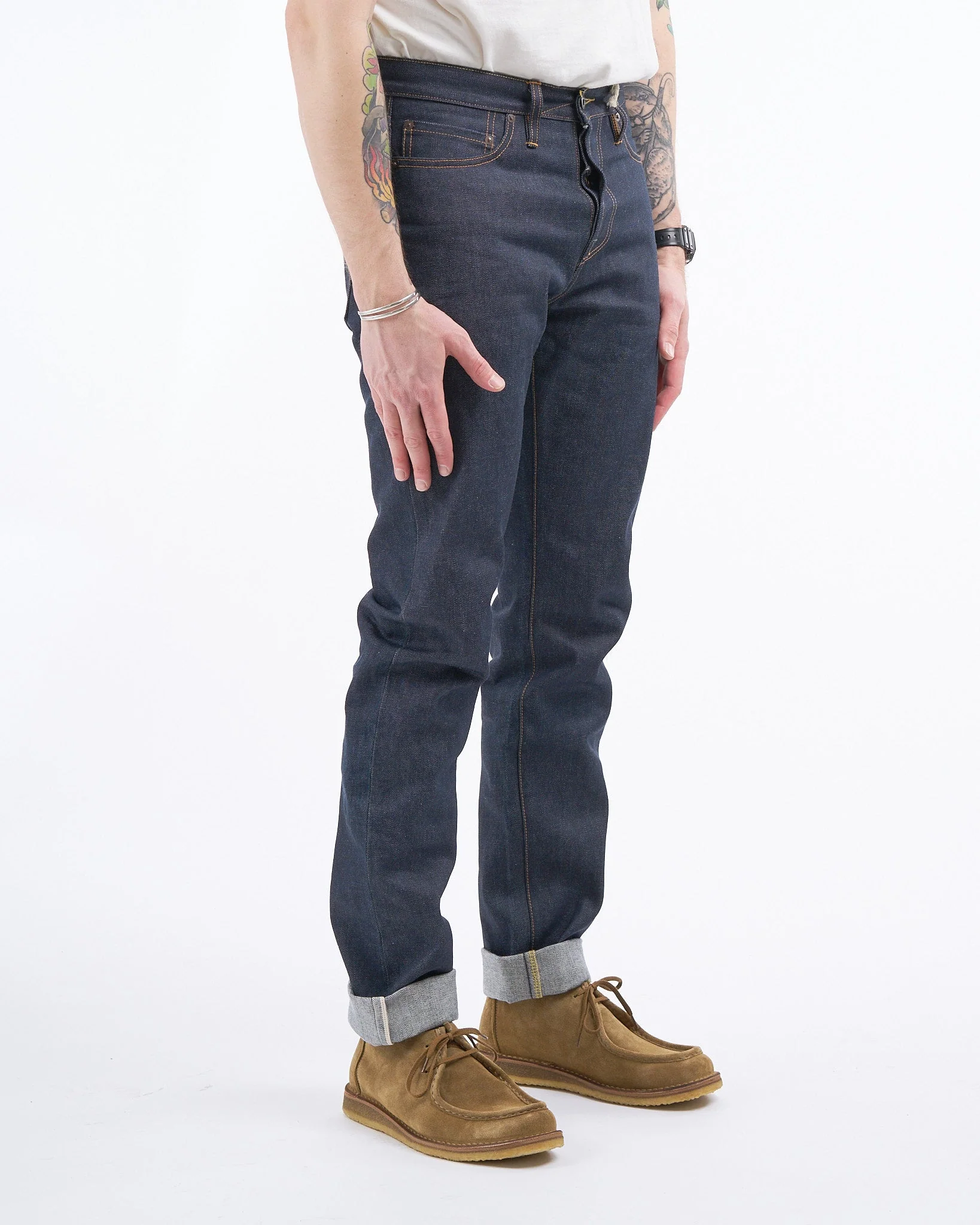 Introducing the Elgin by Tellason - the mid-rise slim tapered fit jeans that radiate timeless style. Crafted with our proprietary Kaihara Japanese orange line raw selvage denim, these jeans are sanforized to preserve their fit and prevent shrinkage. A classic button fly, extra heavy pocket bags, and the bottom of back pockets lined for durability enhance the utility of these jeans. Topped off with a Tanner Goods leather patch, the Elgin jeans are made to last. With graduated inseams from 34.75" to 36", these jeans are designed to provide an ideal fit. Handcrafted in San Francisco, California, USA, the Elgin jeans embody classic American denim craftsmanship. The Elgin was inspired by the stylish Mr. Steve Kang, owner of BlackBlue in St. Paul, Minnesota, and it reflects the vintage charm of Ladbroke Grove in London.