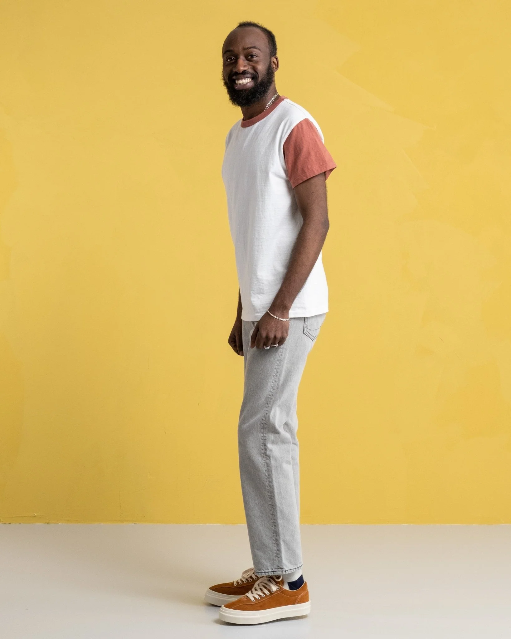 La'ie SS T-Shirt Off White / Spiced Apple "Brooklyn Robins" from Sunray Sportswear. Sunray T-shirts have a traditional fit inspired by the feel of the 50's. Relaxed and slightly shorter sleeve than the Haleiwa with contrasting colours paying homage to the Brooklyn Robins baseball team. The collar, rib-design and fabrics are also traditional. 260 g. Made in Japan.